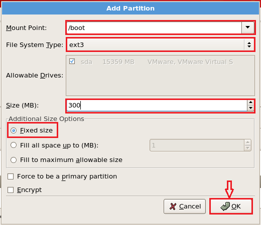 Create /boot partition as shown below. The maximum expected boot size is not more than 200-300 MB. So you can give space accordingly
