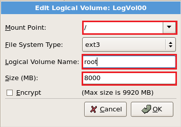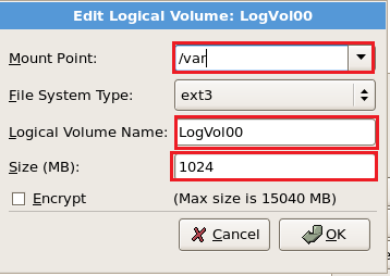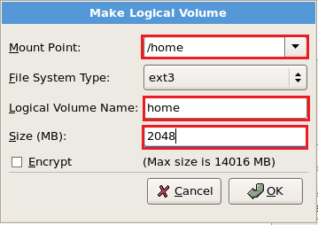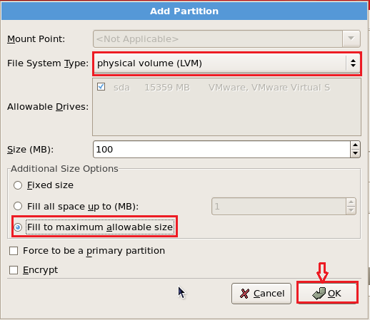 Now again select New and create a LVM partition of all the available hard disk as shown below. Select the options as shown in RED