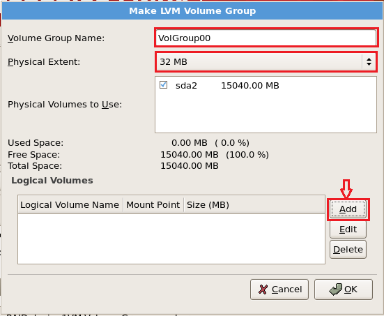 Next click on Add as shown below to create other LVM partitions such as root, home, var, tmp as per your requirement