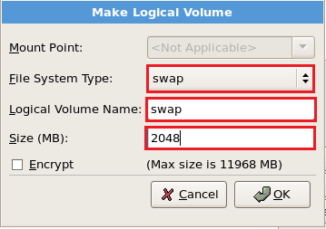 Create a swap partition. No mount point required for it. Just select a file system type as swap and allocate the size. For our case 2048 MB