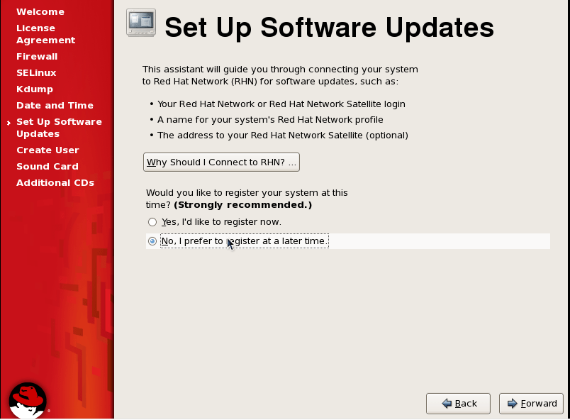 In this step you can register your server with RHN so that it can get regular updates for all the patches and bug fixes regularly. As of now we will skip registering, I will show you to do the same from terminal in my next post.