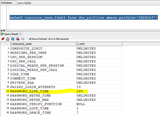 select resource_name,limit from dba_profiles where profile='DEFAULT';