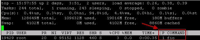 Here 'psr' column shows the last used core by the process. I have used pgrep to grep the pid of the process running by the name of 'fio'. Everytime I hit the same command I observe the processor to be changing