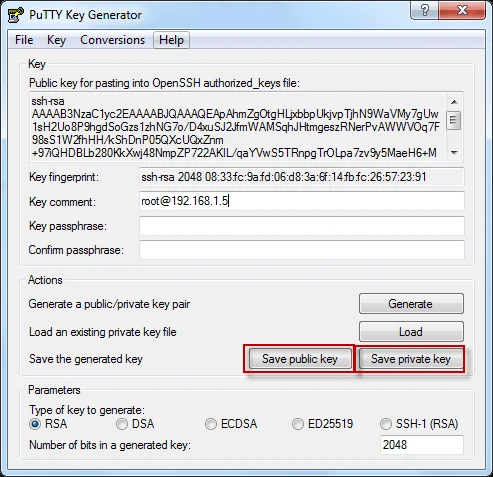 The public key can be seen in the highlighted section, copy this and append the key to /root/.ssh/authorized_keys on 192.168.1.5 (my Linux box)