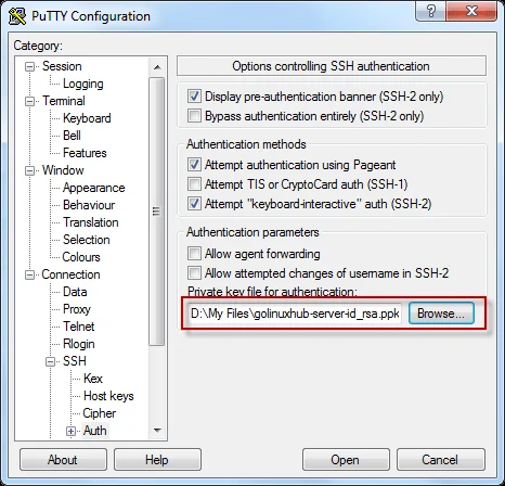 and Browse to the private key which was created above